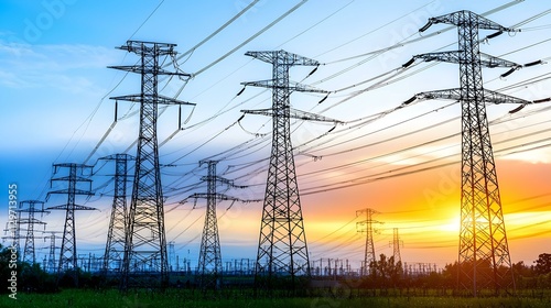 © HeyFahmi, Fototapeta premium Majestic high-voltage power lines at sunset. Silhouetted against a vibrant sky.