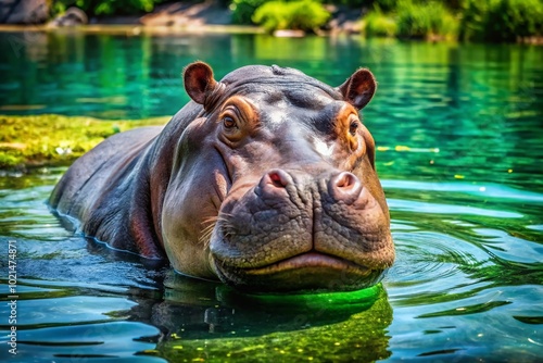 Fototapeta premium Majestic hippo lounging in serene waters, showcasing its massive size and unique features in nature