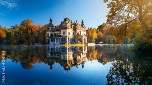 © Pascal, Naklejka premium Majestic historical building reflected in a calm lake amid autumn foliage.