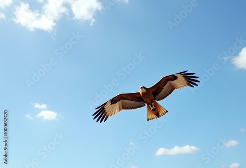© Eliane, Obraz premium Majestic Honey Buzzard in Flight: Panoramic Sky Photography - Ultra-Wide Angle Capture of Soaring Raptor with Outstretched Wings Against Blue Heavens