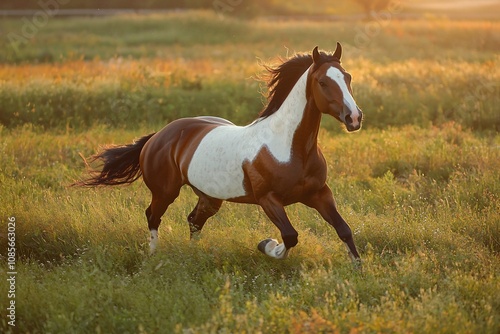 © Adi, Obraz premium Majestic Horse Galloping Through a Sunlit Meadow