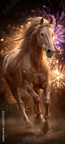 Fototapeta premium Majestic Horse Galloping through Fireworks: A spirited horse gallops gracefully through a mesmerizing display of fireworks, embodying freedom, power, and the thrill of celebration.