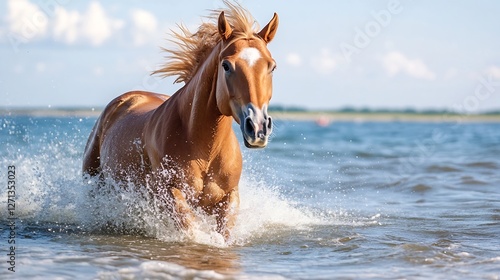 Fototapeta premium Majestic Horse Galloping Through Shallow Waters Splashing Waves Under Blue...