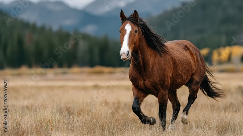 Fototapeta premium Majestic horse gallops freely across the golden meadow under cloudy skies