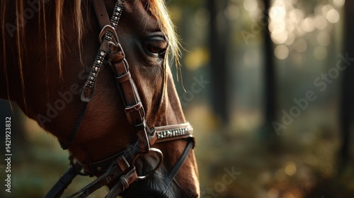 © Kitsada, Obraz premium Majestic horse portrait serene forest photograph natural light close-up beaded bridle