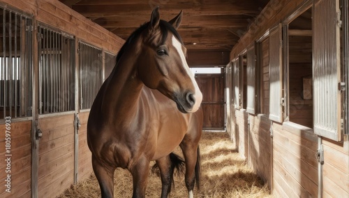Fototapeta premium Majestic Horse Standing Comfortably Inside a Cozy Wooden Stable.