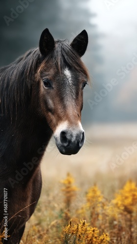 © Michael, Naklejka premium Majestic horse standing in a foggy field surrounded by tall grass and autumn foliage