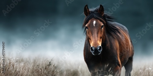 © Georg, Obraz premium Majestic horse standing in a misty field at dawn with a serene backdrop of nature