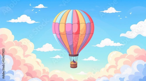 Naklejka premium Majestic hot air balloon ride clipart, cloud skies, flat art, simple cartoon 2D