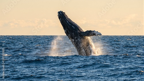 © GMeta, Fototapeta premium Majestic humpback whale breaching at sunset in ocean