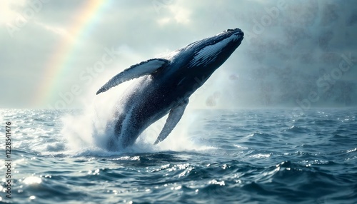 Fototapeta premium Majestic Humpback Whale Breaching Ocean Rainbow