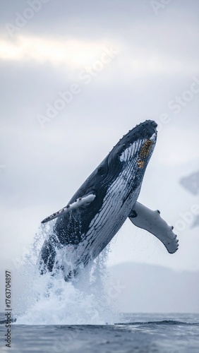 © andi, Fototapeta premium Majestic humpback whale breaching out of the ocean water.