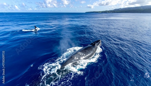 Fototapeta premium Majestic humpback whale gracefully breaching the ocean surface, alongside a...