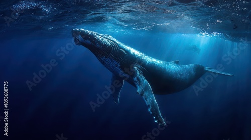Obraz premium Majestic humpback whale gracefully gliding through deep ocean waters illuminated by gentle sunlight
