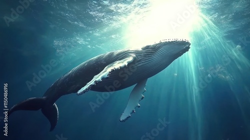 Naklejka premium Majestic humpback whale gracefully swimming underwater, sunbeams illuminating...