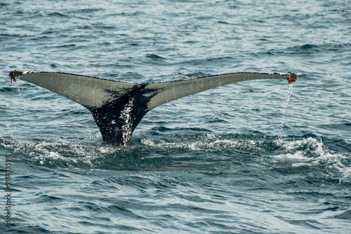 © Zireael, Obraz premium Majestic Humpback Whale Tail Emerging From Ocean Waters. Teriberka, Murmansk district, Russia