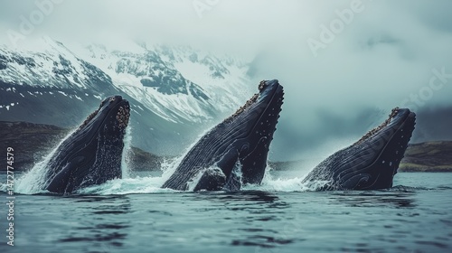 Fototapeta premium Majestic humpback whales breaching in a frigid ocean scene.