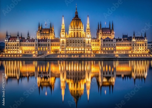 © Man888, Fototapeta premium Majestic Hungarian Parliament Building Night Reflection, Symmetrical Architecture, Warm Tones