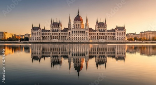 © Slamet, Fototapeta premium Majestic Hungarian Parliament Building reflected in calm Danube River at sunrise
