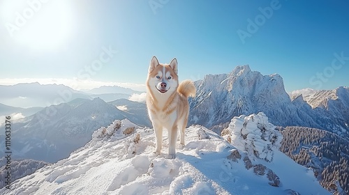 Fototapeta premium Majestic Husky Standing Proudly on a Snowy Mountain Peak Under a Bright Blue...