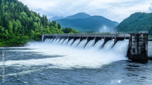 Fototapeta premium Majestic Hydroelectric Dam Surrounded by Lush Green Forest and Serene...
