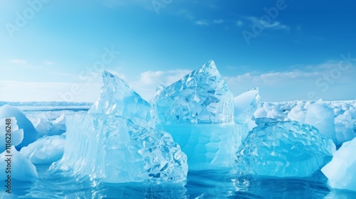 © pueb, Obraz premium Majestic iceberg silhouette in light blue and white against a deep blue ocean backdrop