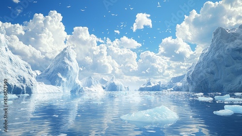 Fototapeta premium Majestic Icebergs Floating in Tranquil Blue Waters Under Bright White Clouds in a Stunning Polar Landscape