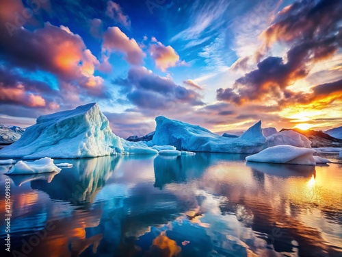 © Four888, Naklejka premium Majestic Icy Landscape: Dramatic Sky, Floating Icebergs, Serene Arctic Scene
