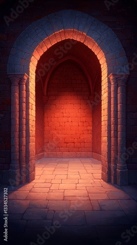 © Chaithat, Fototapeta premium Majestic Illuminated Stone Archway Entrance Enchanting Castle Digital Art Mystical Ambiance Low Angle Captivating Journey