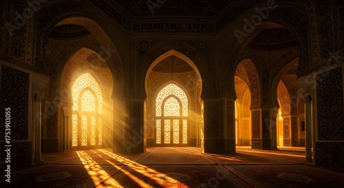 Obraz premium Majestic Islamic Mosque Interior with Golden Sunbeams Streaming Through Ornate Windows