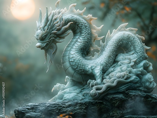 © Thawatchai, Fototapeta premium Majestic Jade Dragon Sculpture Glowing in Moonlit Mist