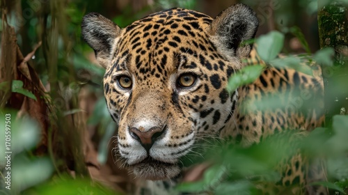 Obraz premium Majestic Jaguar Captured in Lush Amazon Rainforest Perfect for HighEnergy...