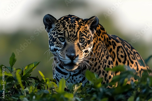 © Mandan, Obraz premium Majestic Jaguar Portrait in Lush Rainforest