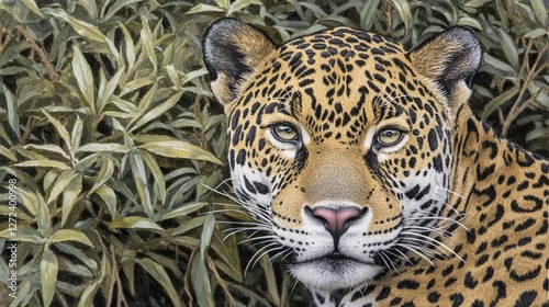 Obraz premium Majestic jaguar portrait, lush foliage background, wildlife conservation
