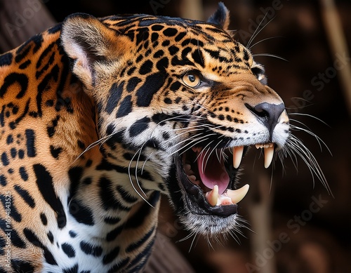 Obraz premium majestic jaguar roaring fiercely showcasing its powerful jaws and striking...