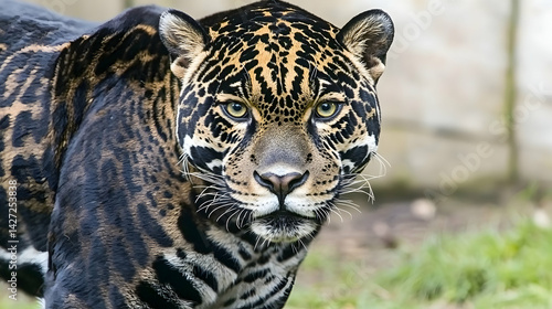 Obraz premium Majestic jaguar stares intently, zoo enclosure background, wildlife...