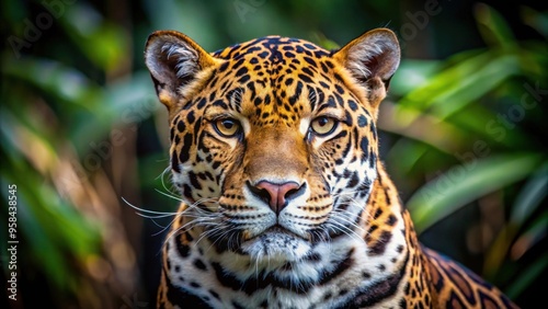 © Nasnunt, Obraz premium Majestic jaguar with sleek fur and piercing eyes, Wildlife, predator, feline, endangered, nature, beautiful