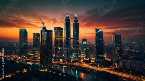 Obraz premium Majestic Kuala Lumpur Skyline at Sunrise: Breathtaking Aerial View of Petronas Towers and Cityscape