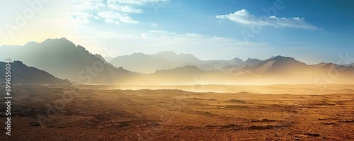 Naklejka premium Majestic landscape of sand sun and rocky peaks at sunset. Golden horizons. Panoramic view of arid desert bathed in warmth of setting sun. Endless sands. Journey vast and serene at dusk