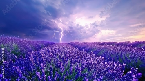 Naklejka premium Majestic Lavender Field Under Dramatic Sky with Lightning Strikes