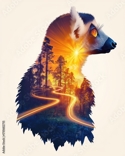 © Sirapopmillion, Obraz premium Majestic Lemur Silhouette with Forest Landscape and Dramatic Sunrise Light on a Winding Road for Nature, Wildlife, and Surreal Art Concepts