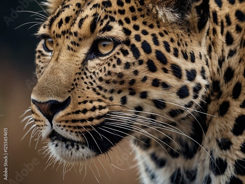 © Jzef, Naklejka premium Majestic Leopard Close-Up Portrait in Natural Habitat with Fierce Expression and Beautiful Spotted Coat