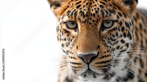 Fototapeta premium Majestic leopard gazes intently with piercing eyes in a serene, snowy...