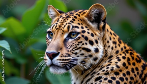 © Angelo, Fototapeta premium Majestic leopard observing its surroundings in a lush green habitat nature photography close-up view