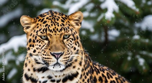 © Khawar, Fototapeta premium Majestic Leopard Portrait in a Snowy Winter Forest