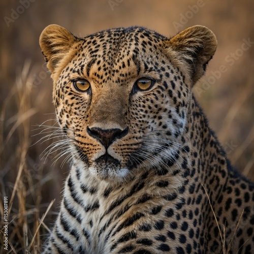 Fototapeta premium majestic leopard portrait on Savana blurred background powerful wildlife photography.
