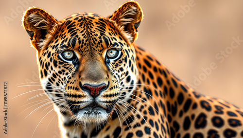 © thanaseth, Obraz premium Majestic leopard portrait on Savanna with a blurred background. Powerful wildlife photography.