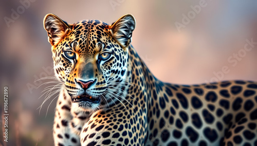 Obraz premium Majestic leopard portrait on Savanna with a blurred background. Powerful...