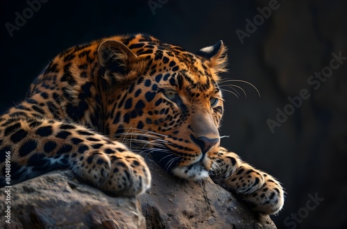 © pisan thailand, Naklejka premium Majestic Leopard Resting Attentively on Rocky Terrain in Dark Wilderness Environment