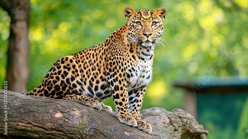 © taweesak, Naklejka premium Majestic Leopard Resting on Tree Branch in Lush Green Forest